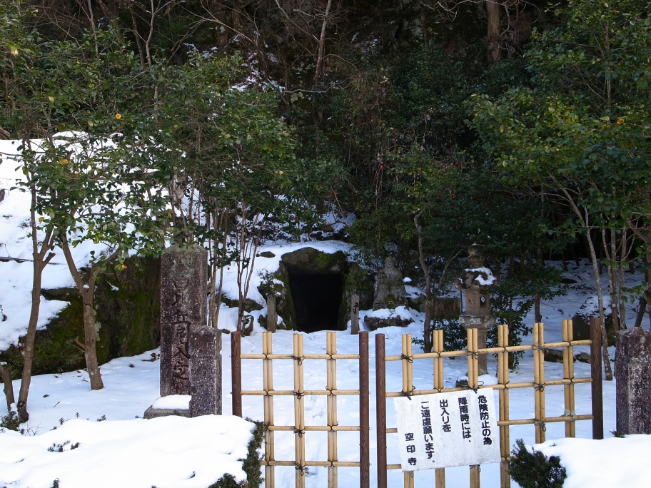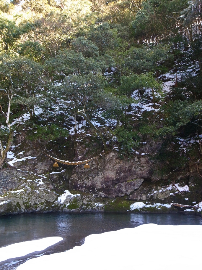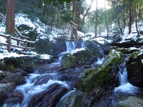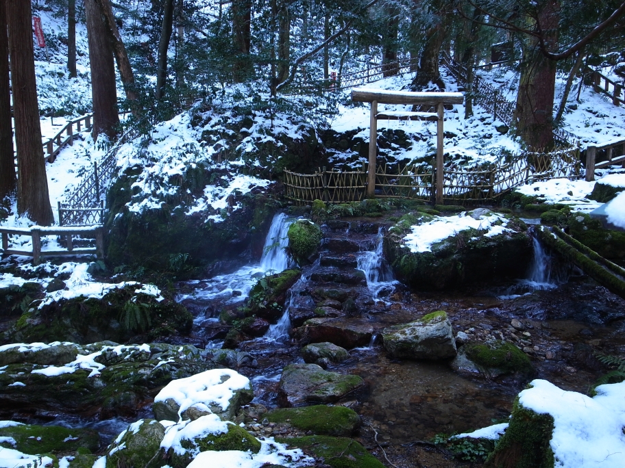 9:30頃天徳寺着。まずお参り。鳥居までのアスファルトの道は昨日の昼に融けた雪が凍っている。参道はせいぜい3-4cmの積雪。歩くのに全く問題ない。錫杖は良い感じ。シャンシャンと鳴らしながら進むと、その音で道が開ける感じ。まさに魔除け。森の中、滝周辺は他に人がいなくて静か。