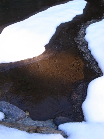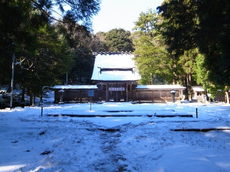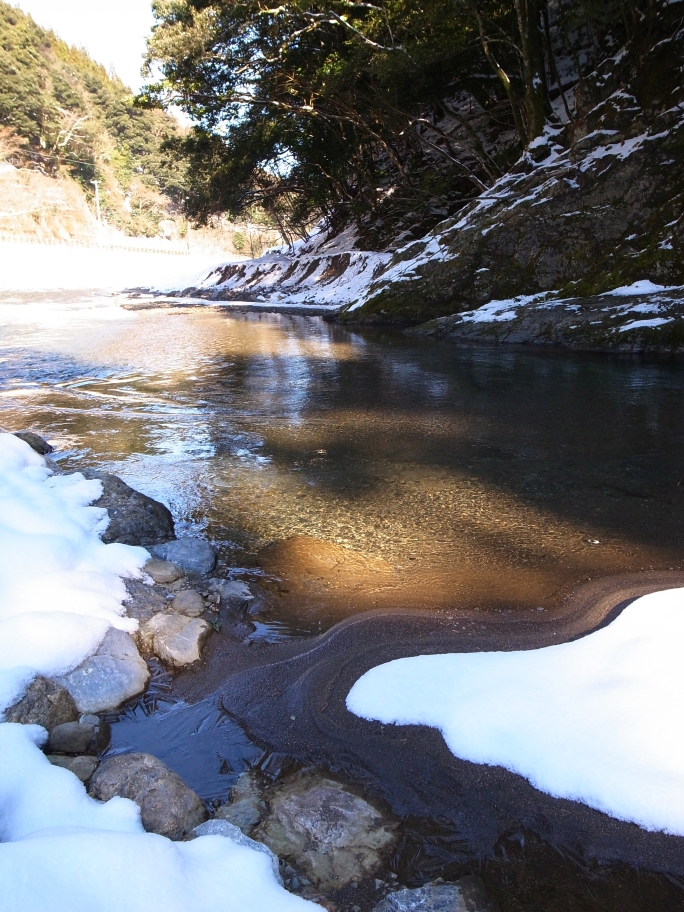 鵜の瀬手前の川沿いの道、日陰は圧雪が融けずに残っており、危うくスリップしそうになる。 まず白石社にお参り。椿の倒木は片付けられていた。きれいになって良かった。