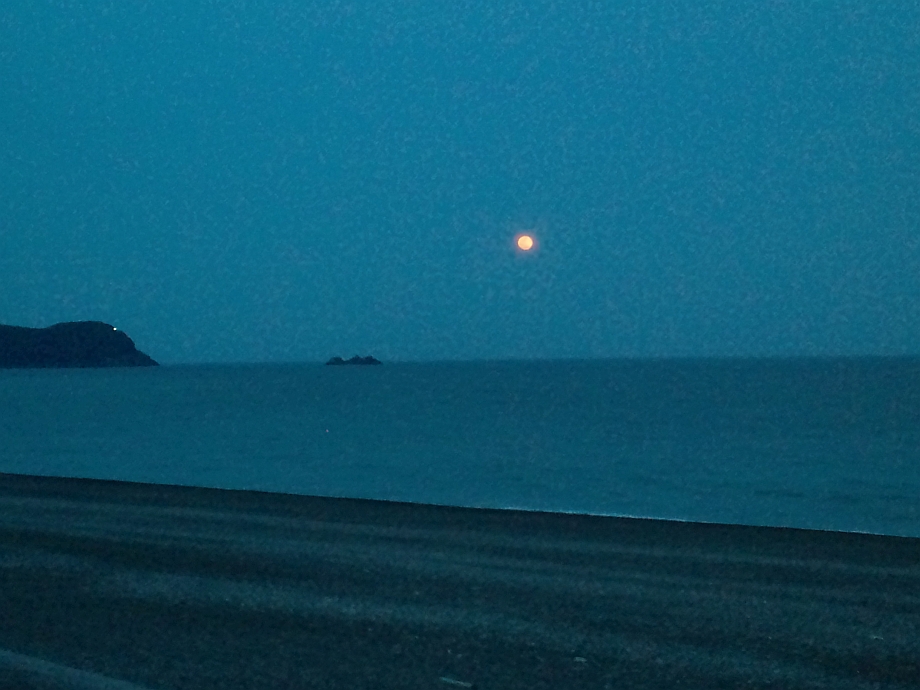 海岸からきれいに満月が見える。赤いおぼろ月。
