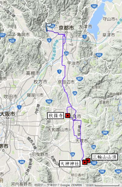 12:00過ぎ、大神神社出発。箸墓古墳横、天理市内を抜け奈良市内方面へ。
