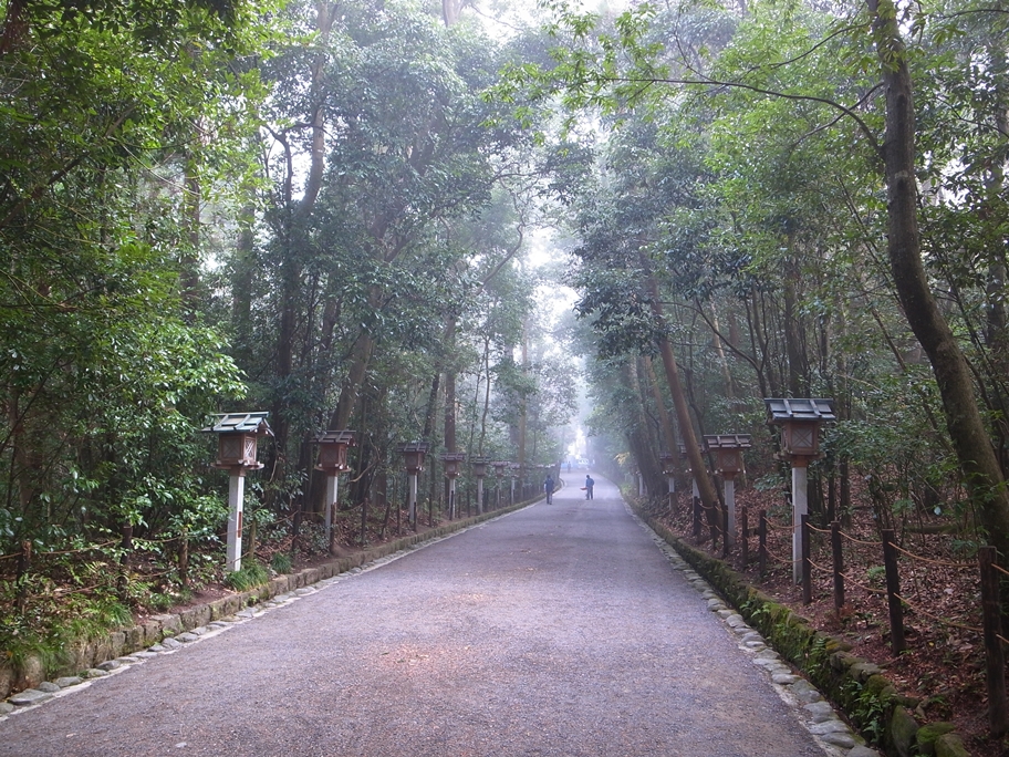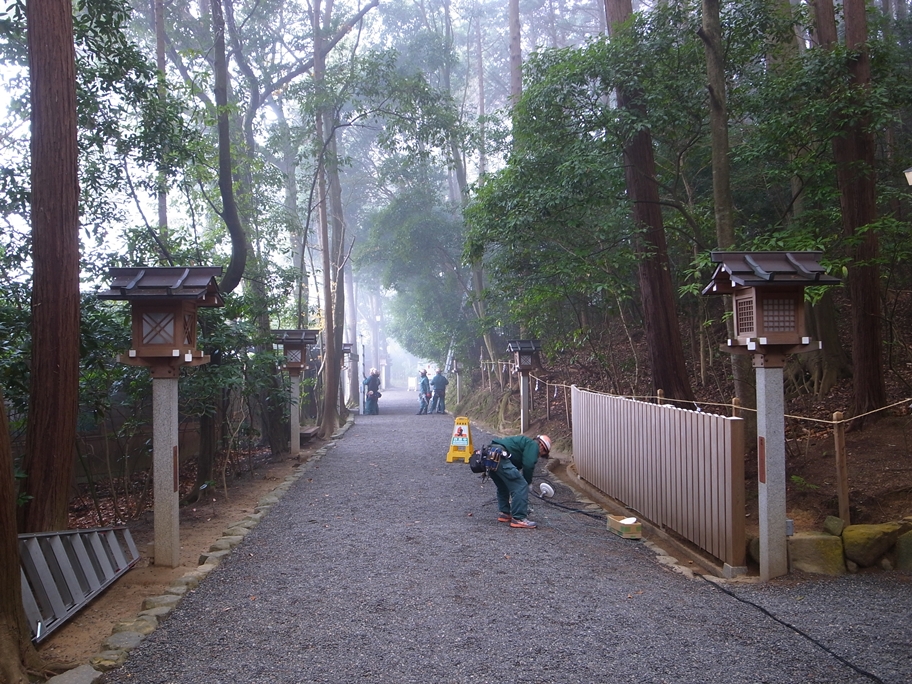 三輪山への登拝口のある大神神社摂社・狭井神社への参道。初詣客のための電灯設置工事が行われている。