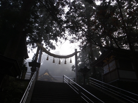 登拝口前で奉幣にて自ら御祓い・お清めをし、登り始める。霧の中で木漏れ日が差し始め、霧の中なのに光が非常にクリアに見える。この世とは思われない光。言葉に言い表せない。