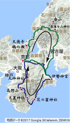 昨年12月12・13日の行程と今回の行程を重ねてみると(図2)、私がこれまで巡っている「水の道」の全体図がよくわかる。ただ、このように全体を右回りで巡ったのはこの一連のお参りが初めてだった。今回はまたいつもとは違った出会いや新たな新鮮な感覚があった。白山から若狭、京都・奈良・熊野に水を降ろす左回りのコースと、白山から伊勢に水を送り、熊野、奈良、京都と水を巡らす右回りのコースと、それぞれに意義があるのであろう。右旋・左旋のそれぞれの意味についても考えながら、お参りを続けて行きたいと思った今回の巡拝であった。