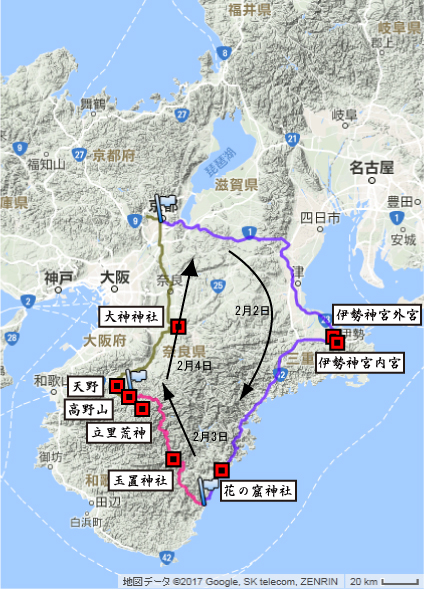 2月2日朝、京都を出発し名神・新名神・伊勢道を経由して伊勢神宮へ。外宮・内宮をお参りし、おはらい町にて昼食、再び伊勢道に乗り、紀勢道・国道42号を通り熊野灘沿いに南下し、三重県熊野市の花の窟神社に参拝、さらに南下して新宮市内にて宿泊。