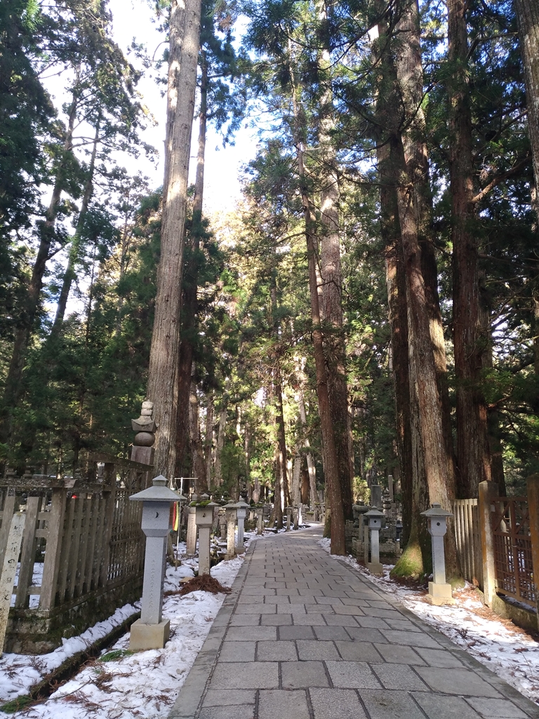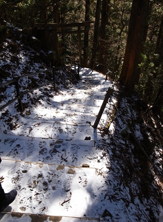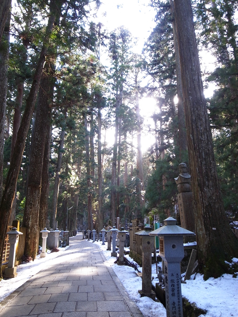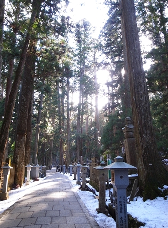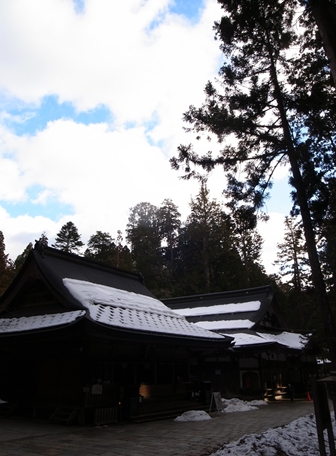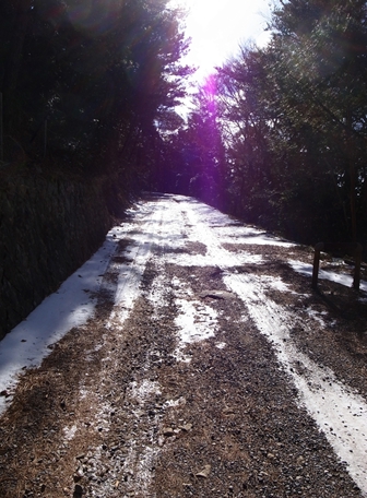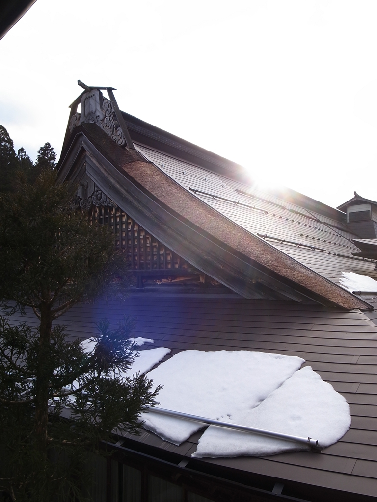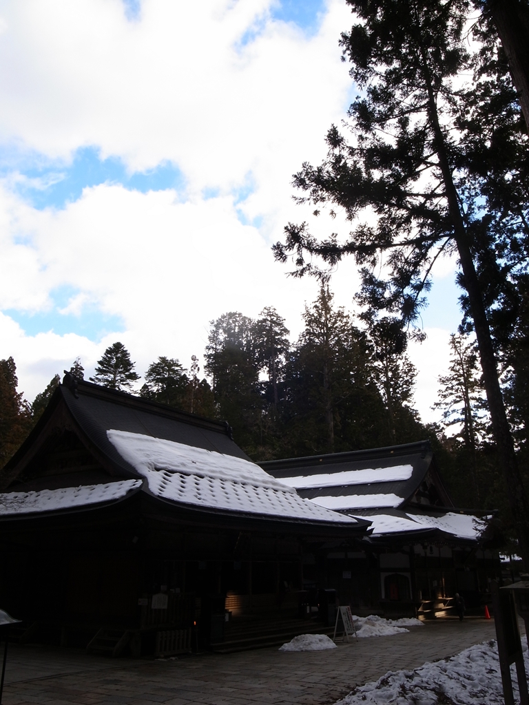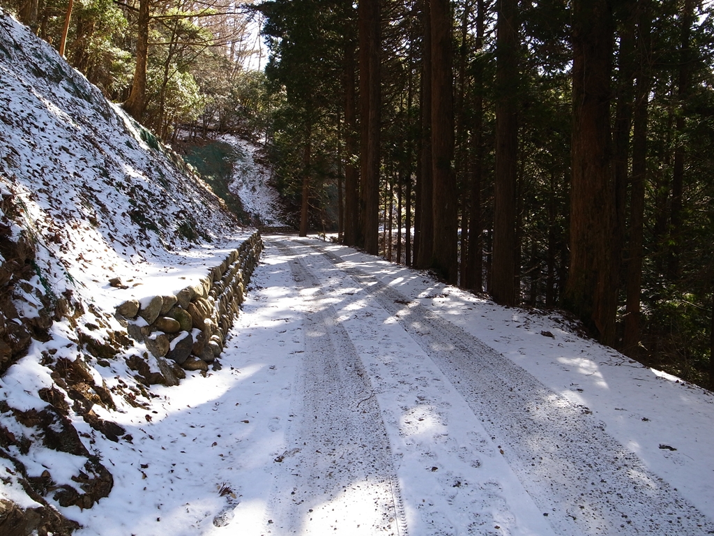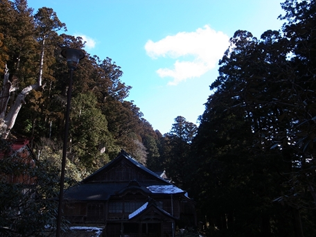 猿谷ダムのダム湖を渡り、野迫川から高野山に抜ける県道に入る。もし雪が深かったら、安全のためそのまま国道168号で五条まで抜けて橋本・九度山から高野山に登り直そうかと思っていたが、雪はさほどでもなさそうなので山越えの道を進む。結果、滞りなく高野山内へたどり着くことができた。