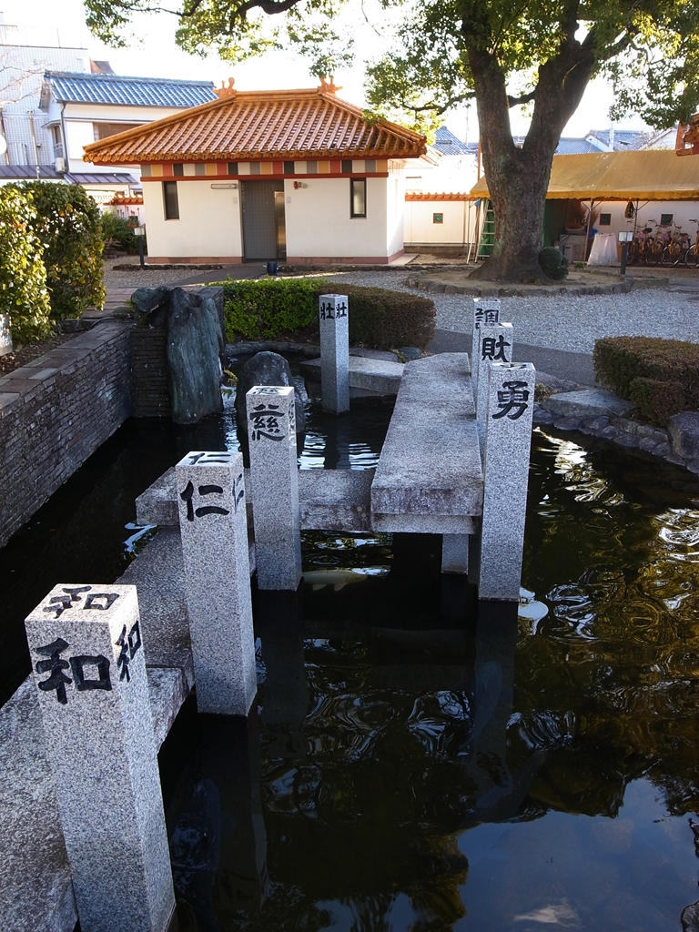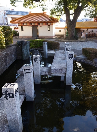 不老の池。徐福と共に渡来した七重臣がそれぞれ有していた人徳を表す文字が彫られている石橋。