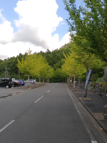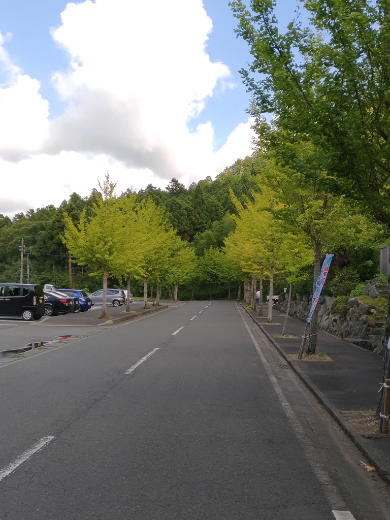 瓜割の滝駐車場。もうだいぶ秋の空で、空気が澄んでいる。銀杏の葉もわずかに色づき始めている。