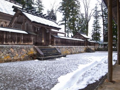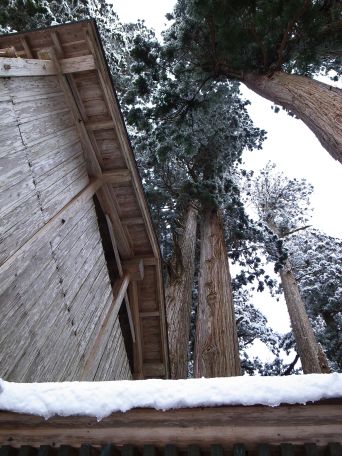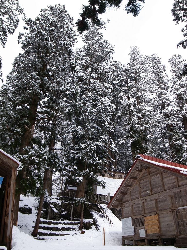 本殿を見上げる。階段にも雪は積もっているが、何とか登れそうだ。