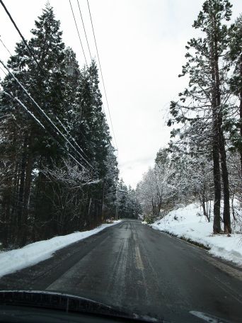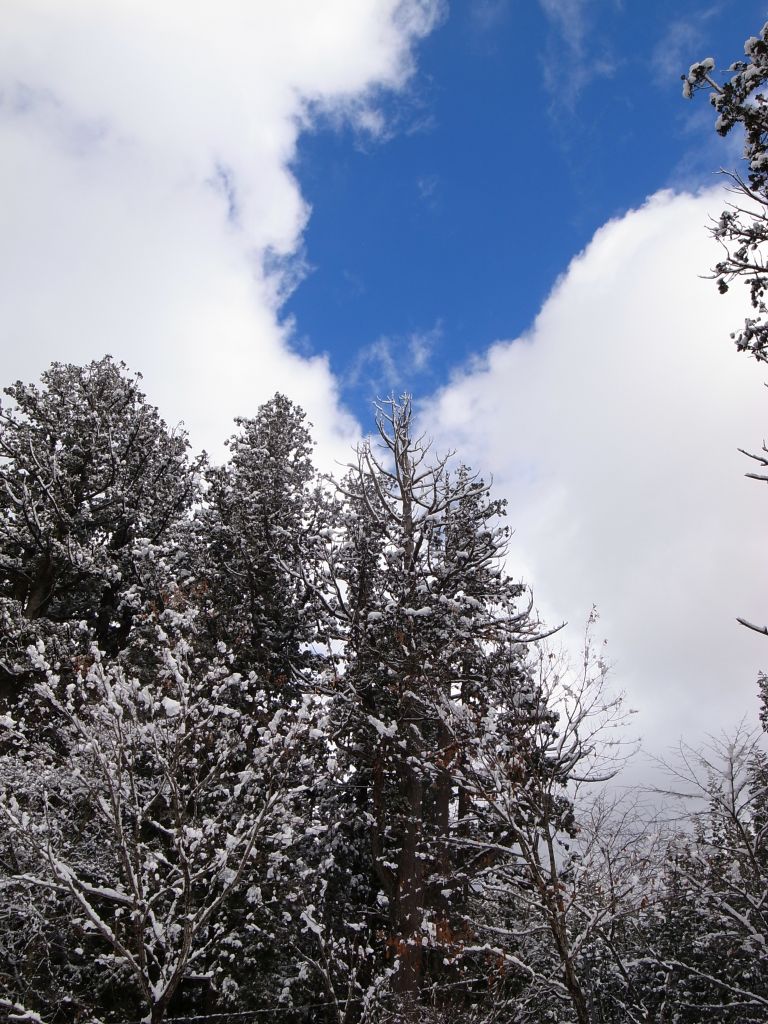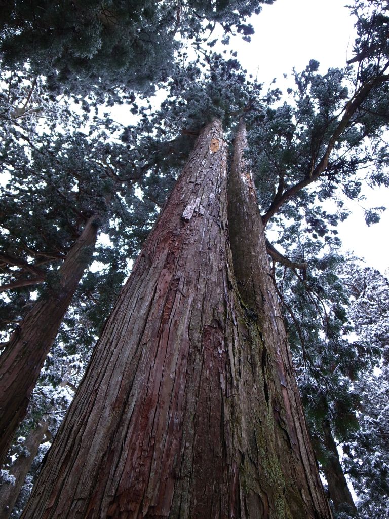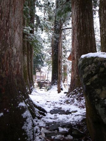 参道から右手(東側)の山々を望む。もう少し登ると積雪が始まる。白山中居神社まで行けるだろうかと、やや心配になる。