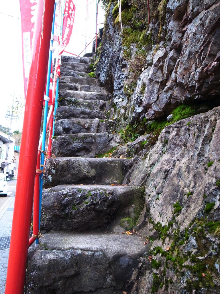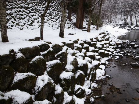 念願のお参りを済ませ、参道を引き返す。宮川の石垣。
