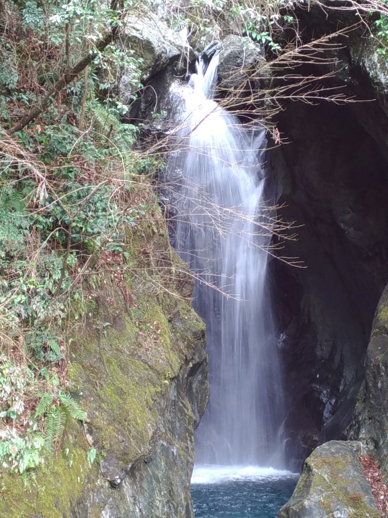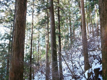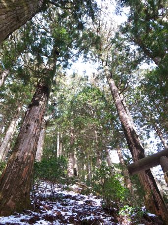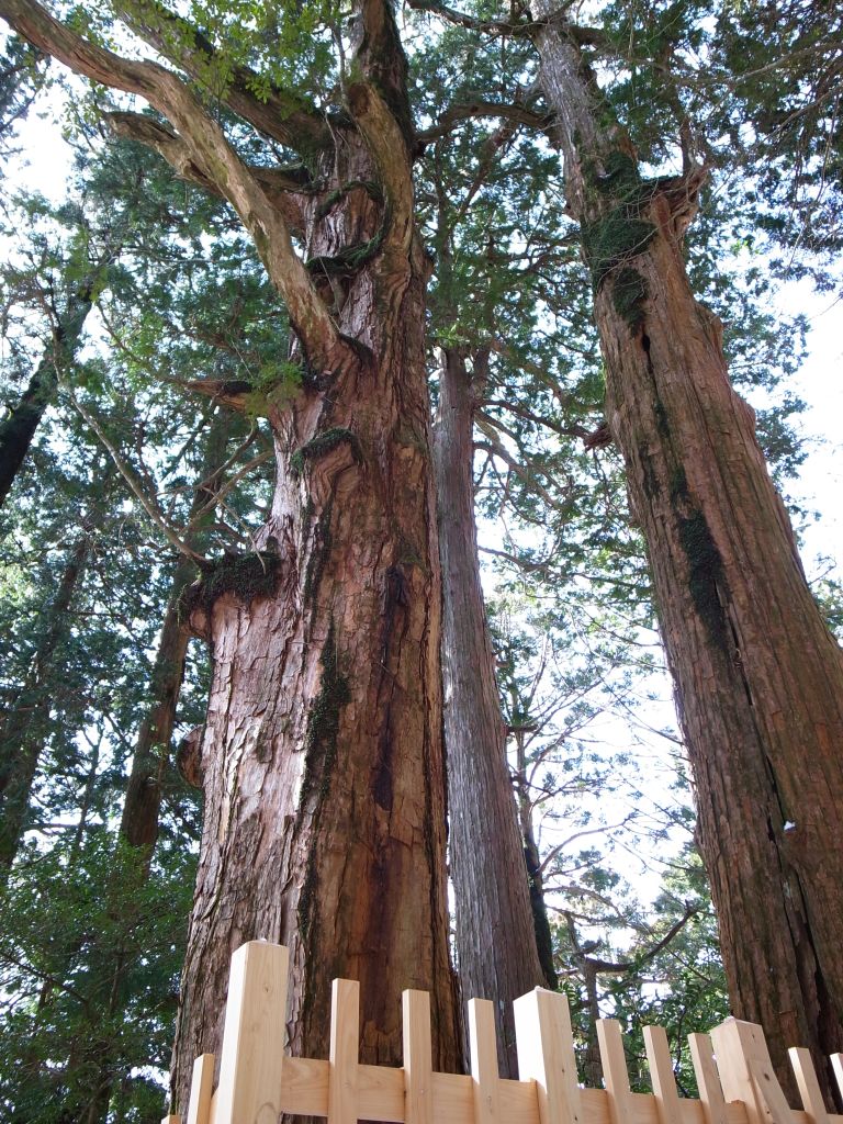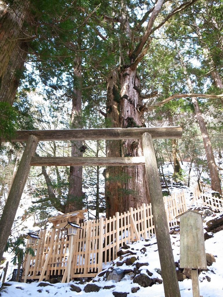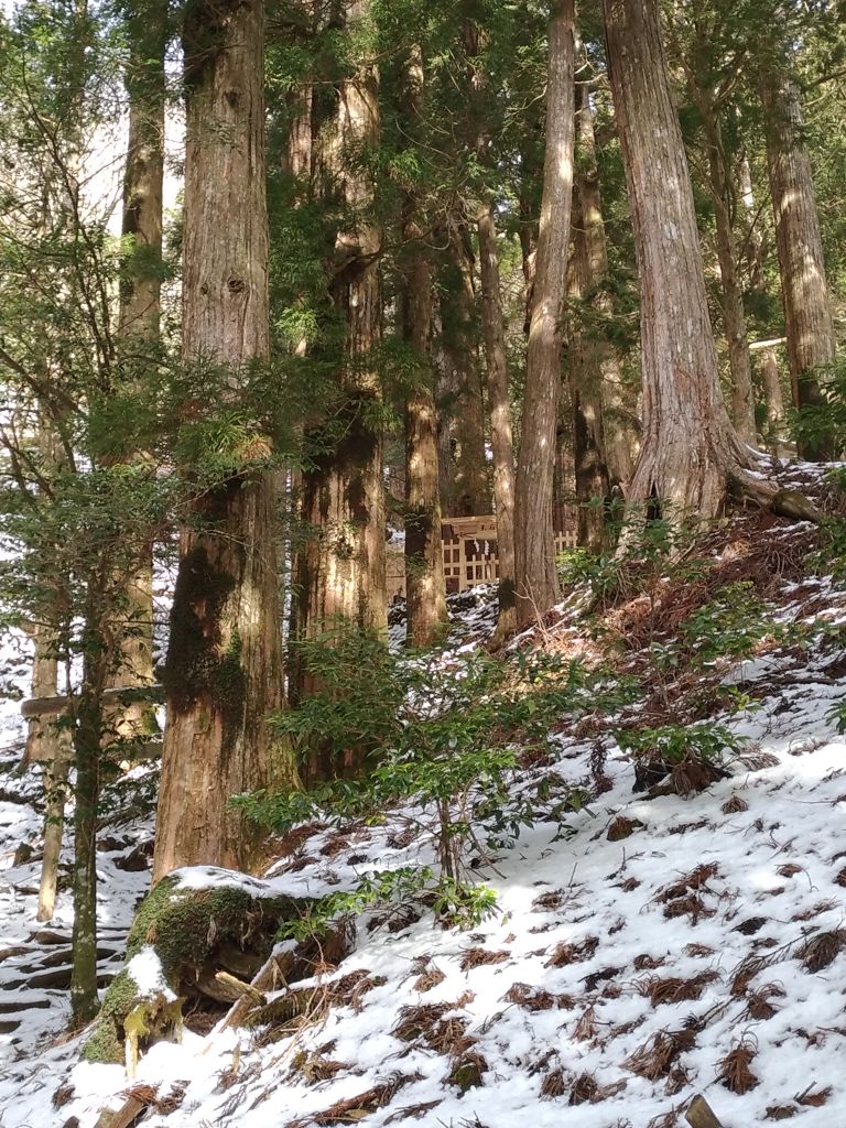 ご神体の玉石を護る3本の杉の大木。大神神社の御神紋も三本杉。漫画家岡野玲子はその作品『陰陽師』の中で大神神社とこの玉石社との繋がりを示唆しているが、興味深い指摘と思う。歴史やこの世的な次元ではその真偽を明らかにすることは難しいかもしれないが、この世的な次元を越えたところで何かを見出すことはできるのかも知れない。その「この世の次元を越える」認識論を得ることが、密教行者としての到達点であり、また同時にさらなる深みに