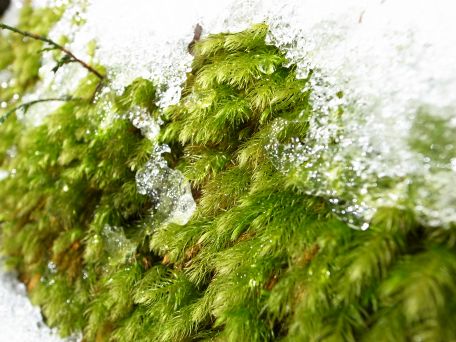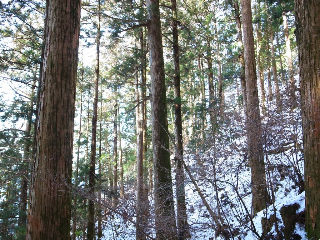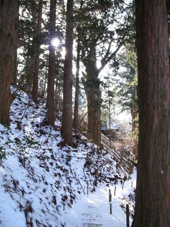 参道横、杉の根元の杉苔の緑が、春が近づいていることを感じさせる。
