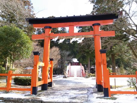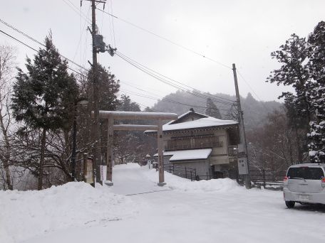 積雪はさほどではないのだが吹雪が酷そうなので、今回は本殿まで登るのは断念し社務所前より遥拝する。
