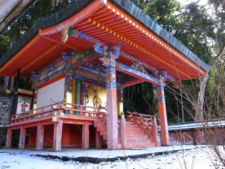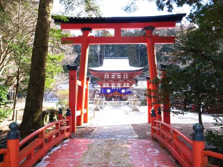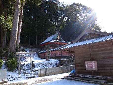 正面から参拝ののち、社殿をすぐ近くから拝見する。彩色が美しい。立里や高野山の吹雪がうそのように日差しが温かい。