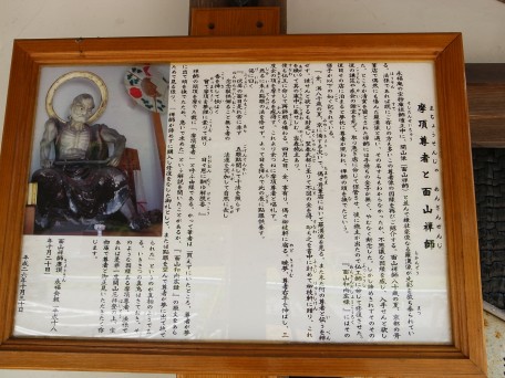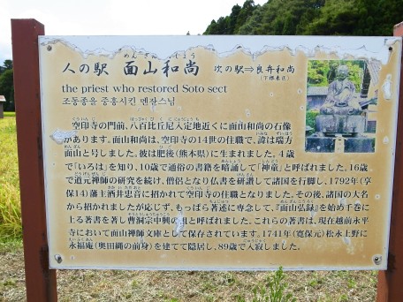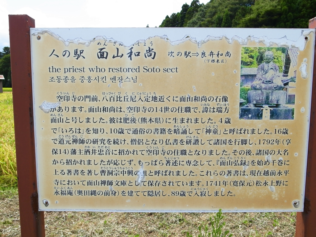 鵜の瀬に向かう途中にはいつも、小浜市上野地区内の「水土里直売所」 に立ち寄って野菜などを買って行くのだが、 今回はうっかりいつもの曲がり角を通り過ぎてしまう。 そこで次の角の田んぼの間の細い道を廻り、上野地区の集落をかすめて直売所に向かった。 この細道に入る角で、これまで気づかなかった「人の駅」の看板を見かける。 これは、小浜(あるいは若狭)ゆかりの人物についての解説が書かれているもので、 鵜の瀬の白石神社の前に、その下根来地区ゆかりの人物として 「良弁和尚」の解説が書かれているのは見ていたが、 このシリーズの他の人物の解説は今回初めて見た。 表題には「面山和尚」と書かれているが、 この時はあぁそういう人がいるんだと思った程度で通り過ぎる。