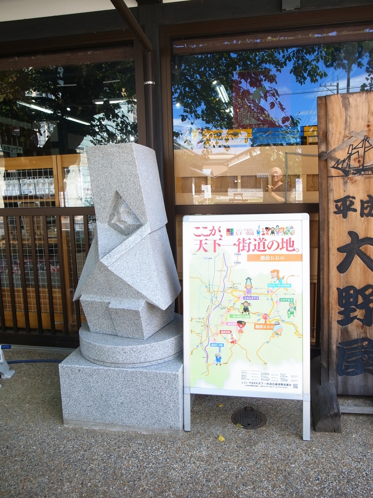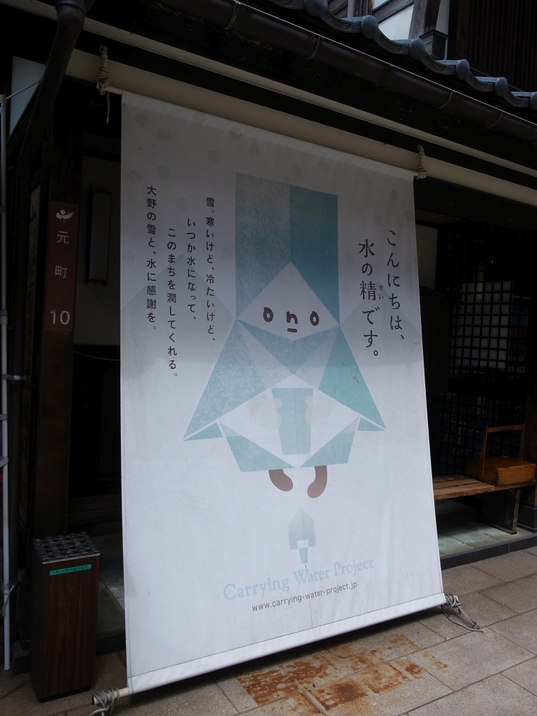 七間通り、大野市観光協会前。「水の精」のキャラクターが愛らしくて気になる。