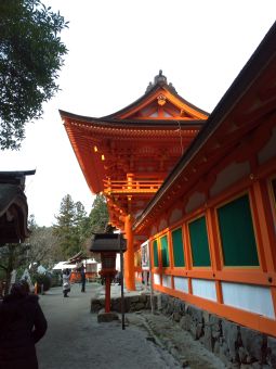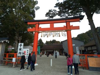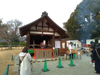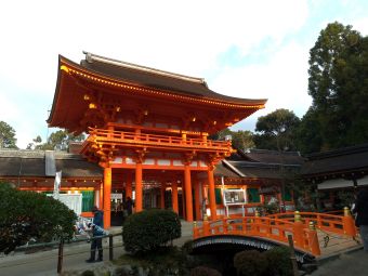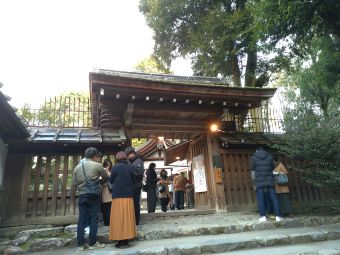 まず、上賀茂神社にお参り。朝9時台はまださほど人が多くない。 またお正月期間はいつもは特別参拝でなければ入れない本殿前まで自由に入れるようになっている。 本殿に続き、こちらもいつもは門の外から遙拝している摂社・新宮神社も間近からお参り。 新宮神社は高龗神(たかおかみのかみ)即ち水の神を祀る。 新宮神社前の門から出て伊勢神宮遙拝所で遙拝し、続いて二葉姫稲荷神社へ。