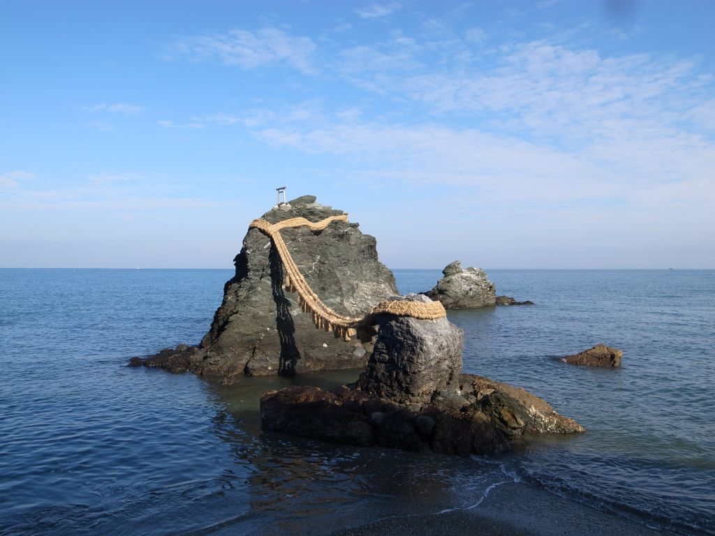当日は朝7時前に京都市内を出発、名神・新名神・伊勢道を経て10時頃に二見浦到着。 無料駐車場は一番奥に一つだけスペースが残っていて首尾良く駐車することができた。 二見浦は初めて訪れるが、夫婦岩の眺めは絵葉書そのままでちょっと笑ってしまう。 また、思ったよりも岸から随分と近い場所にあった。もう少し沖に位置するものと想像していた。 まずは二見興玉神社(ふたみおきたまじんじゃ)にお参りし、さらに海岸線を西に進む。 そして二見浦での主たる目的地、龍宮社にお参り。本殿周辺よりは人もまばらでお参りしやすい。 参拝客の切れ目を見計らい、龍宮御宝前・拝殿の隅で密やかに龍神を供養する作法を修させて頂く。