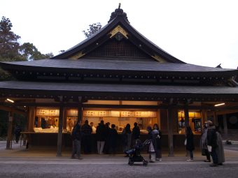 最後に内宮に参拝。夕方の薄暮の中お参りするのは初めてで新鮮な印象。 朝や昼間と違った静かでちょっとひんやりとした空気が心地よい。 正宮はいつもながら巨大な垂直の流れを感じる。 東京スカイツリーくらいの巨大な水晶のオベリスクがそそり立っているようなヴィジョン。