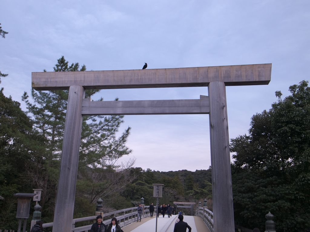 <お参り終わると宇治橋の鳥居の上から烏が見送ってくれる。
