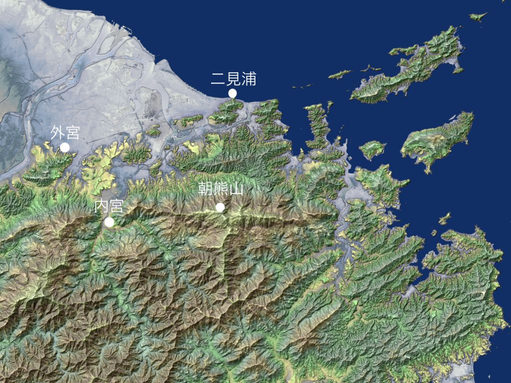 最近、幾つかの筋から「朝熊山に登るべし」という示唆が続き、 伊勢にとって朝熊山はどのような意味を持つのだろうかと思いながら地形図を眺めていると、 朝熊山(朝熊ヶ岳)は志摩半島の最高峰でもあり、 朝熊山ピークとする東西を貫く連山は太平洋と伊勢内宮をじかに繋いでいることがわかる。 そして同時に東から登る太陽を伊勢に導く「脈」でもある。 即ち、朝熊山は水と光によって海と伊勢神宮とを繋ぐ要、 海と伊勢神宮をつなぐ「龍脈」の要となっているのだろう。 従って、伊勢と海とを改めて精細に繋ぐ為には朝熊山へのお参りは欠かせないものと思われる。