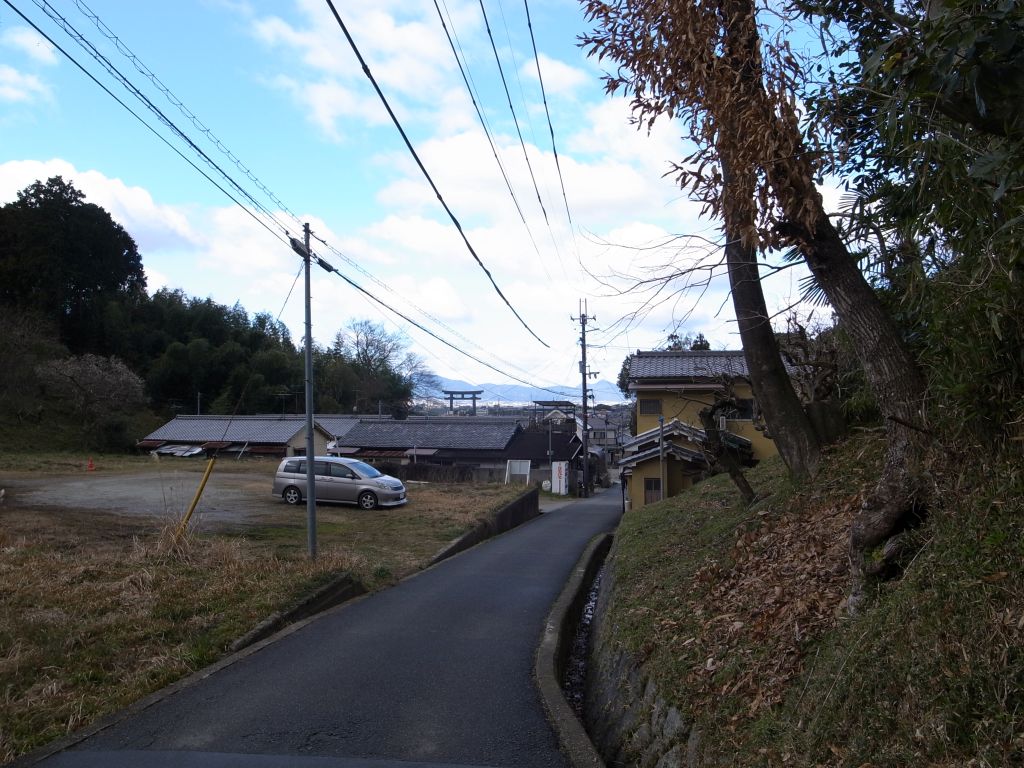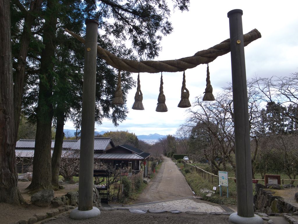 <狭井神社から大直禰子神社へ向かう。空気が澄んでいて、麓の町並みが近く見える。遥かに二上山を望む。>
