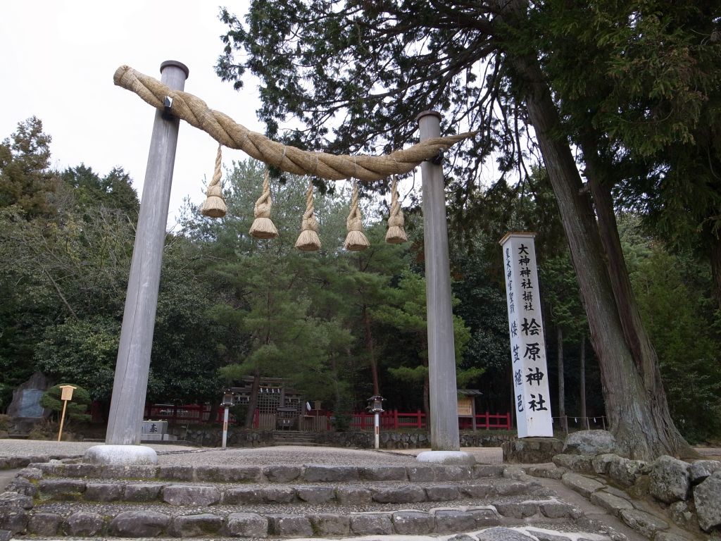 大神神社の北約1km、三輪山の山裾に檜原神社が鎮座する。伝説によればこの地は崇神天皇の御代に天照大御神が宮中より初めて移され豊鍬入姫命(とよすきいりひめのみこと)に託されて祀られた「倭笠縫邑(やまとかさぬいのむら)」とされる。豊鍬入姫命の後を継ぎ倭姫命が天照大神の御杖代として大和国から諸国を廻り、最終的に伊勢国に皇大神宮(伊勢神宮内宮)を創建したとされる。この倭姫命の巡幸の間に天照大神が祀られた地を元伊勢と称するが、この檜原神社は言わば元伊勢の筆頭に当る。