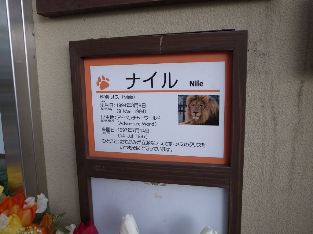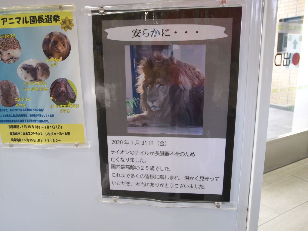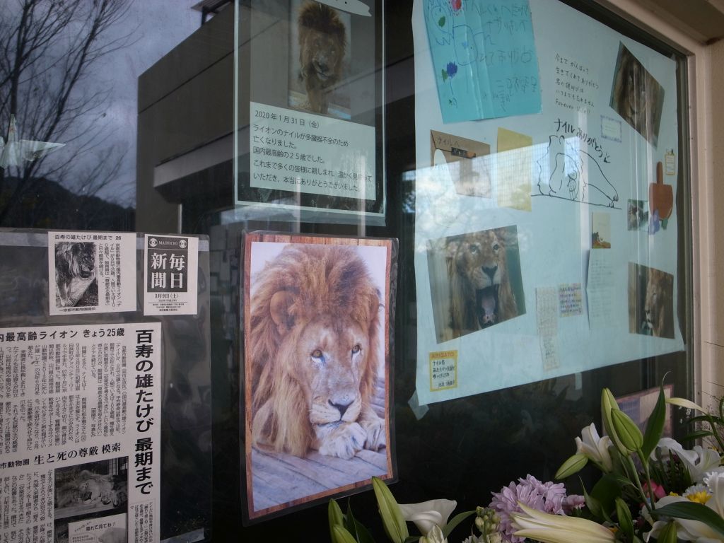 奈良でのお参りの後京都に戻り、京都市動物園へ。このお参りの数日前、去る2020年1月31日に京都市動物園のライオン、ナイルさんが亡くなっていたことを知る。ナイルさんは国内最高齢のライオンで、以前見た時その威厳ある姿に感銘を覚えていたので、その訃報を知りとてもショックを受けた。ローカルニュースでライオン舎の前に献花台が設けられていると知り、この日ナイルさんのお見送りに伺うことにした。