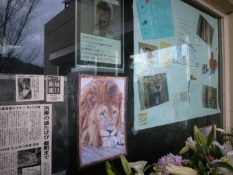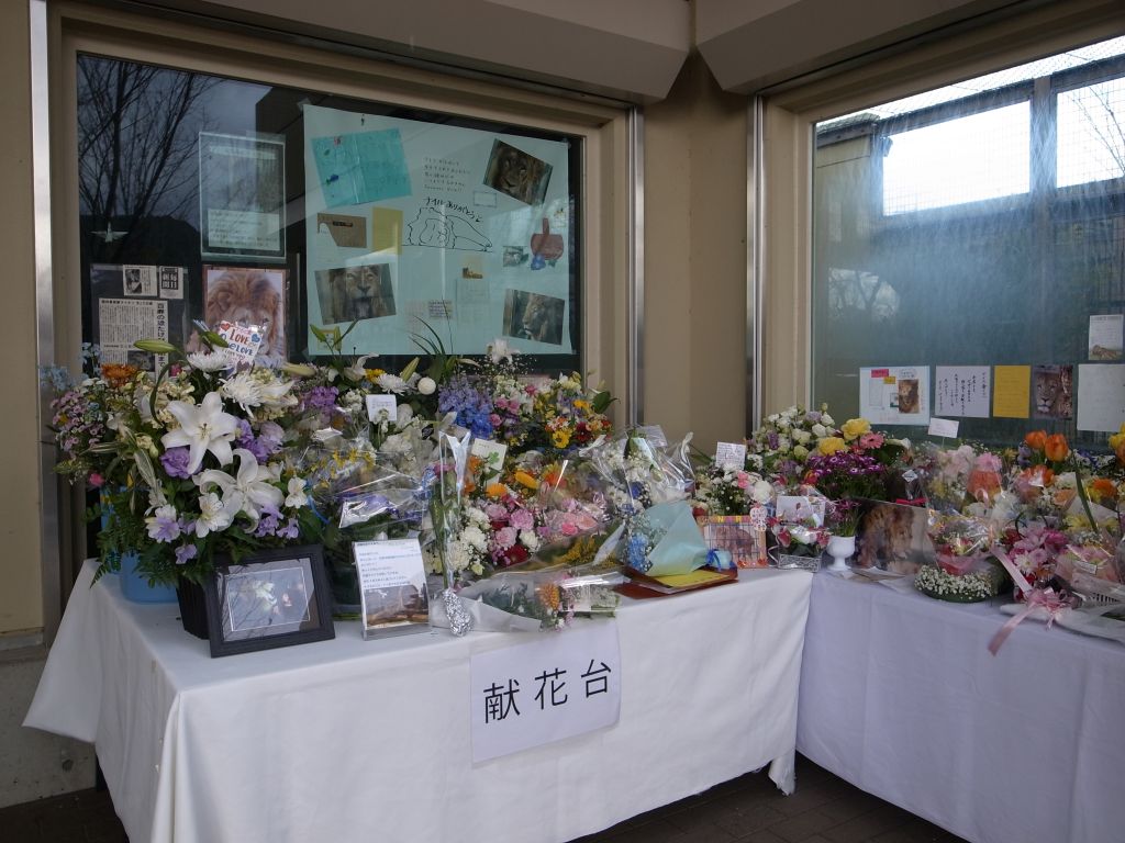 <ライオン舎前に到着。献花台には沢山のお花が手向けられている。>
