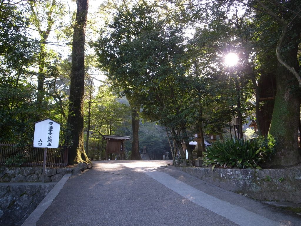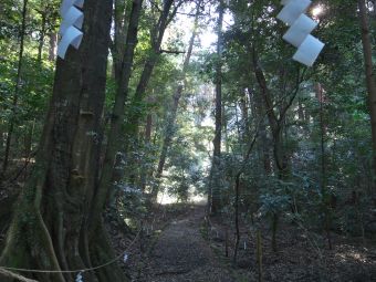 <続いて奥の禁足地へ。入り口前より禁足地奥の祓戸神社を遥拝する。禁足地は朝日が射し明るく爽やかであった。