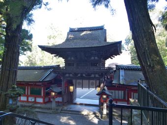 <拝殿前でのお参りを終え、楼門向かいの出雲建雄神社ほかの摂社にお参り。楼門を振り返る。>