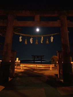 午前0時前、白鬚神社到着。お参りしようと拝殿正面に進むと、神秘的な風景に目を奪われる。