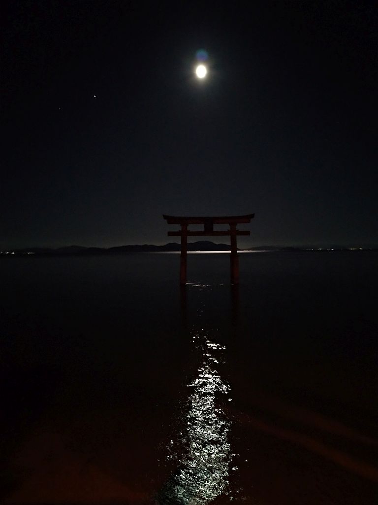 敦賀から国道161号線を滋賀県マキノに抜けそのまま琵琶湖沿いを南下していくと、 月明かりが琵琶湖の湖面を照らしている。満月は前日6日の早朝だったが月は十分明るい。