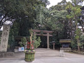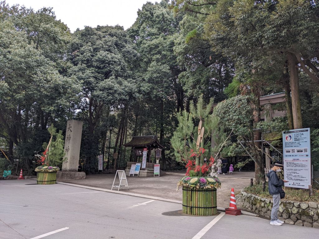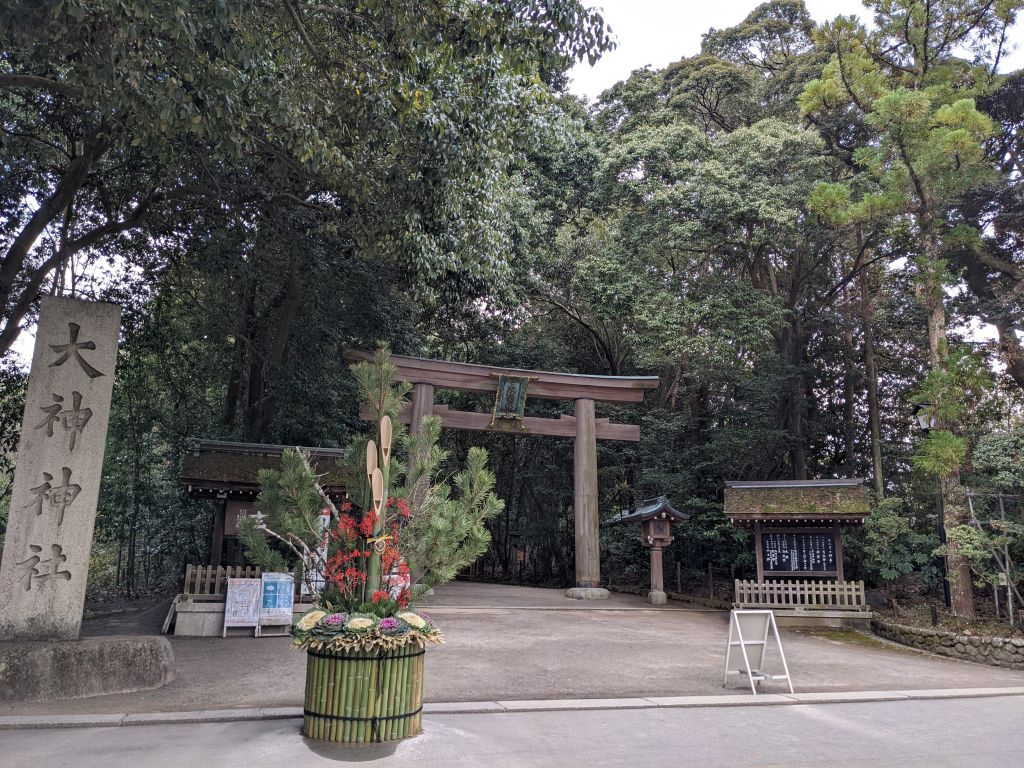 大神神社二ノ鳥居。お正月の準備が進められている。いつもながら見事な門松。
