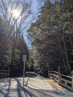 お参り終わって橋を渡り終わった途端に陽が射す。「ここからがスタート。」