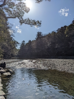 御手洗場(みたらし)。五十鈴川の川面が輝いている。ここでお参り前に身を浄める。