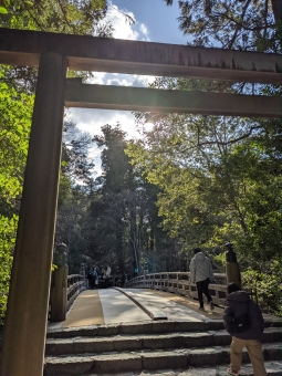 外宮のお参りを終え、結界橋を渡って振り返り一礼。陽の光が強まったような気がする。