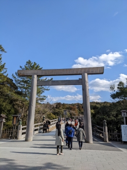 内宮へ。こちらも参拝客が多い。宇治橋近くの駐車場が満車のようなのでおはらい町より手前、 おかげ参道地下道近くの駐車場に車を駐め、おはらい町を歩く。人通りはだいぶ多い。