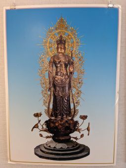 大神神社のかつての神宮寺・大御輪寺には本尊十一面観音はじめ幾つもの仏像が祀られていたが、 明治の廃仏毀釈に際し十一面観音は奈良県桜井市の聖林寺へ、地蔵菩薩は奈良県生駒郡斑鳩町の法隆寺へ、 日光菩薩・月光菩薩は奈良市の正暦寺へ、不動明王は玄賓庵へと移された。 本展では、現在は玄賓庵に収められている不動明王を除く諸尊が再び一堂に会していて、 さながら大御輪寺の同窓会のような様相である。なお、玄賓庵のご住職とは以前お参りに伺った時に 少しお話しをさせて頂いたことがある。今回、玄賓庵の不動明王は出展されていないのは、 ご住職なりのお考えがあってのことなのかも知れないと推察される。 館内には不動明王のみ写真パネルが代わりに展示されていた。